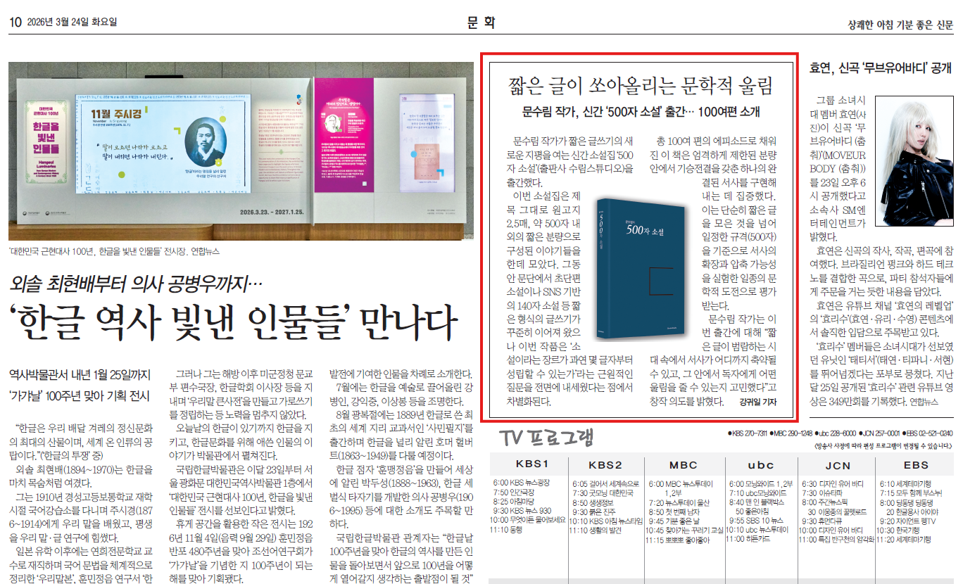 문수림의『500자 소설』드디어 신간 소개 기사가 보도되다